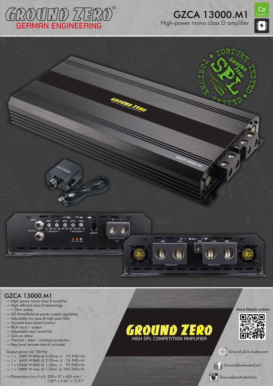 - De siste årene har klasse D-forsterkere i GROUND ZERO COMPETITION-serien blitt en målestokk for enorm effekt til et meget rimelig prisnivå. Neste generasjon klasse D høyeffektforsterkere starter med lanseringen av disse to splitter nye modellene som dekker det essensielle behovet for subwoofere med 1500 og 3000 watt ved 1 ohm laster. Serien vil bli utvidet med kraftigere samt flerkanals modeller.