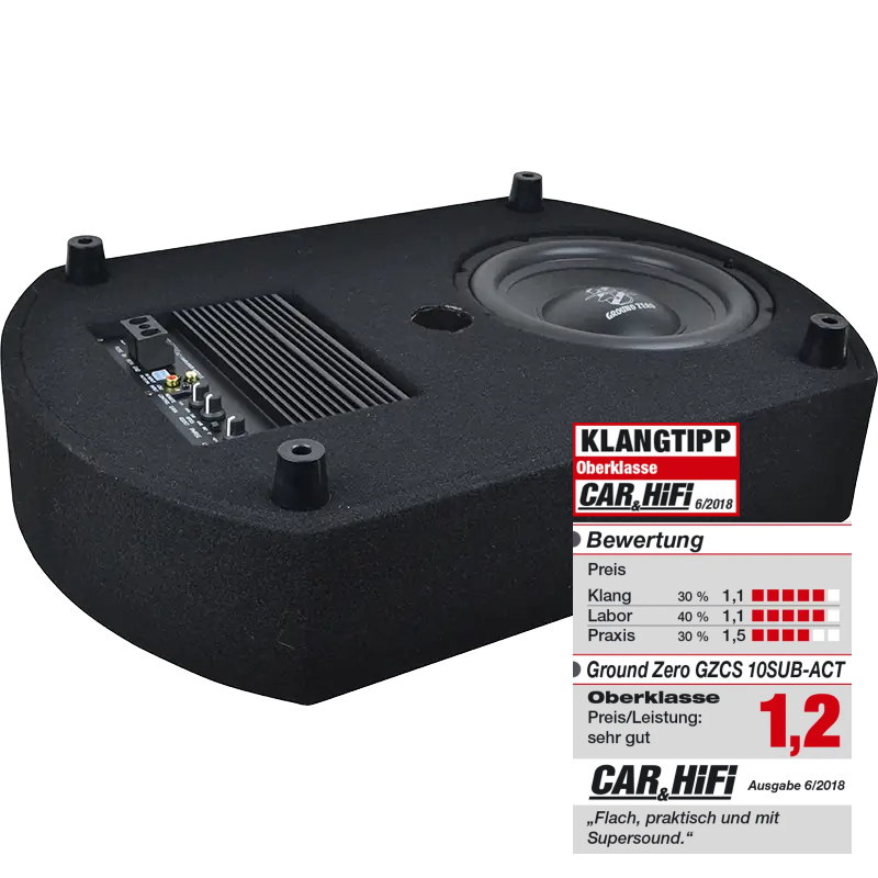 - Ground Zero kommer med en veldig smidig subwoofer løsning for reservehjul. Plassbesparende og samtidig med fyldig lyd som høres ut som en ekte subwoofer. GZCS10SUB-ACT er en 10-tommers subwoofer montert i et 15 liter lukket kabinett sammen med en kraftig klasse A / B forsterker gir frekvensrespons på 30 - 180 Hz.