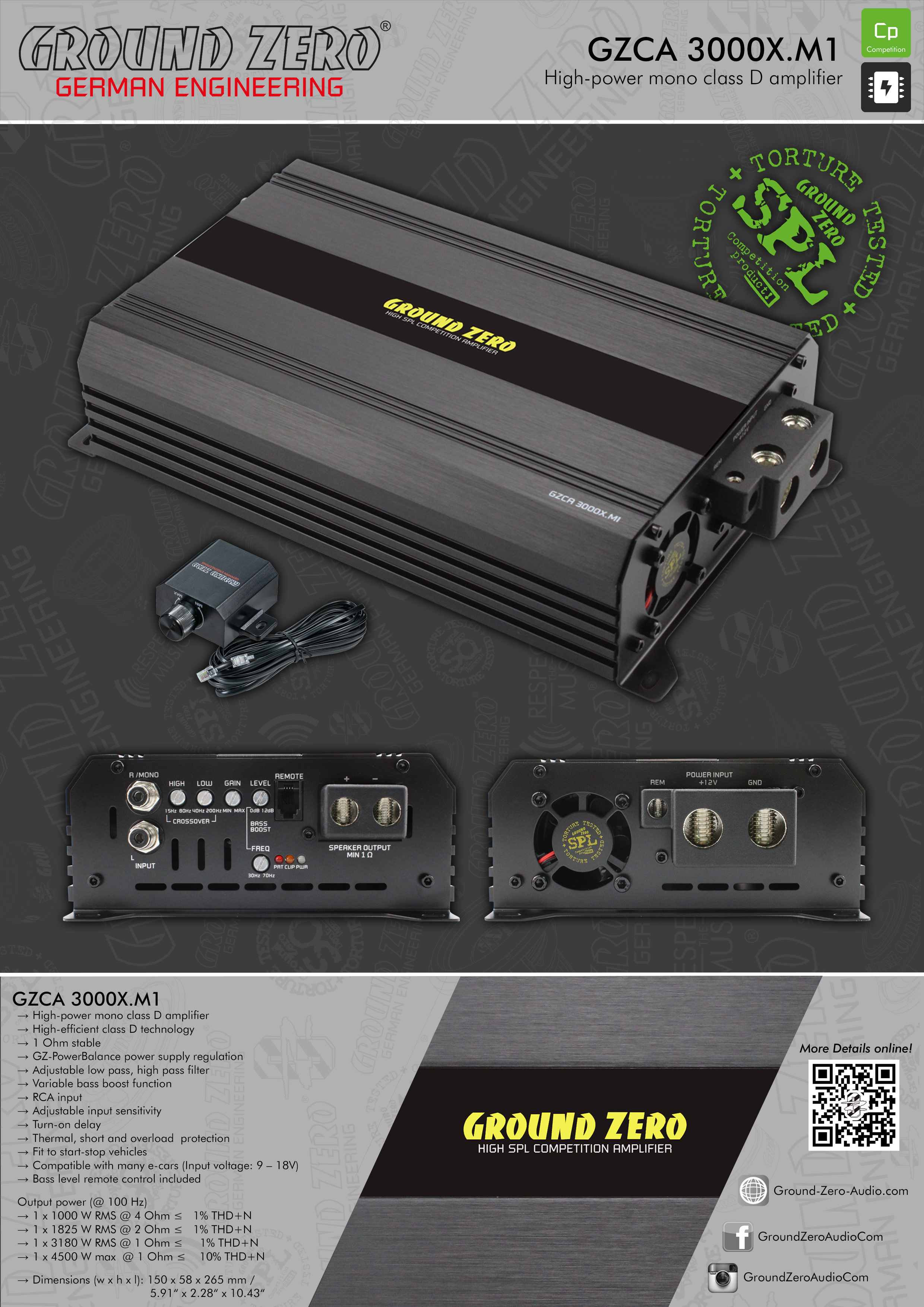 - De siste årene har klasse D-forsterkere i GROUND ZERO COMPETITION-serien blitt en målestokk for enorm effekt til et meget rimelig prisnivå. Neste generasjon klasse D høyeffektforsterkere starter med lanseringen av disse to splitter nye modellene som dekker det essensielle behovet for subwoofere med 1500 og 3000 watt ved 1 ohm laster. Serien vil bli utvidet med kraftigere samt flerkanals modeller.